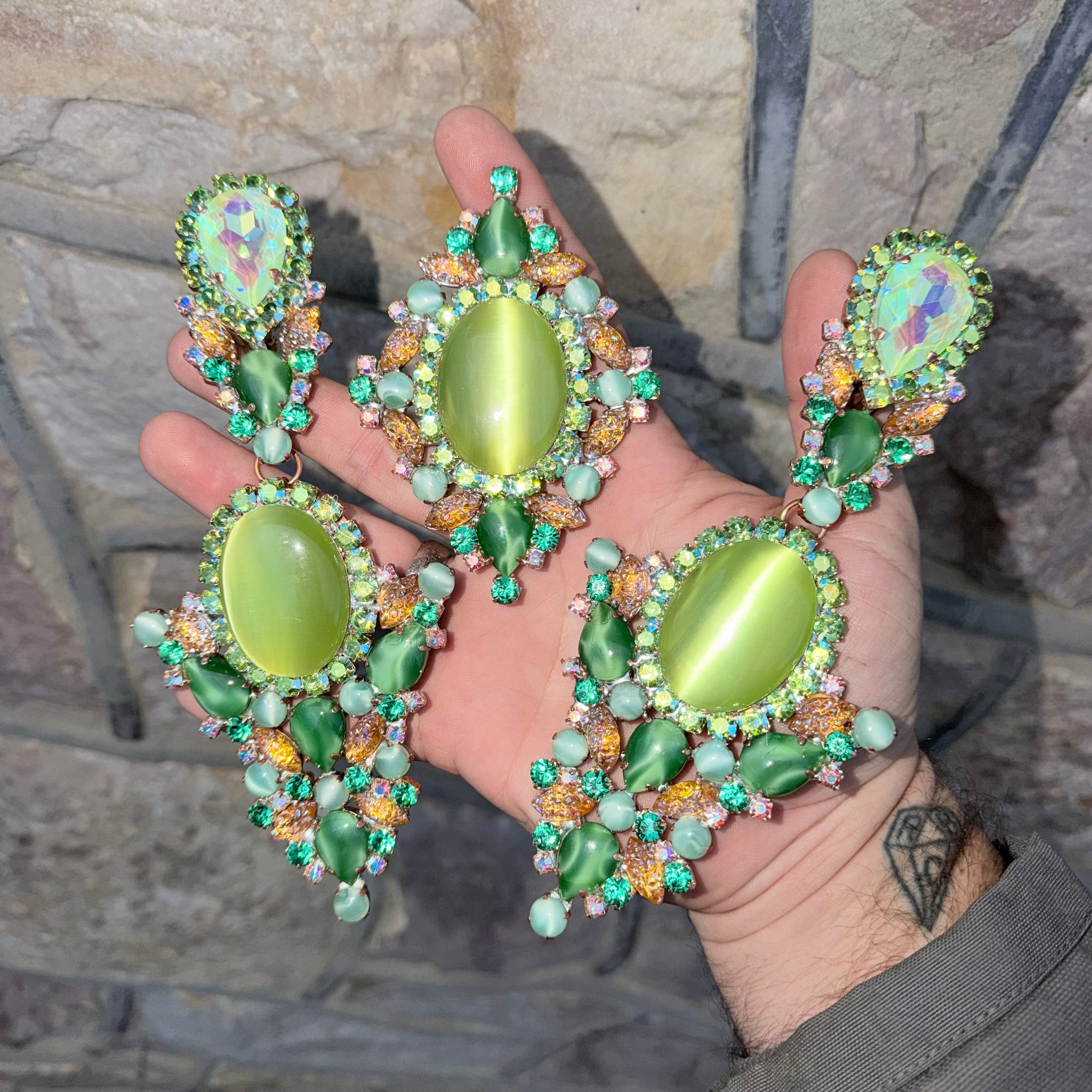 The earrings have clip backs, and the ring features an adjustable ring backing. Made from heavy duty brass settings Imported from Germany.